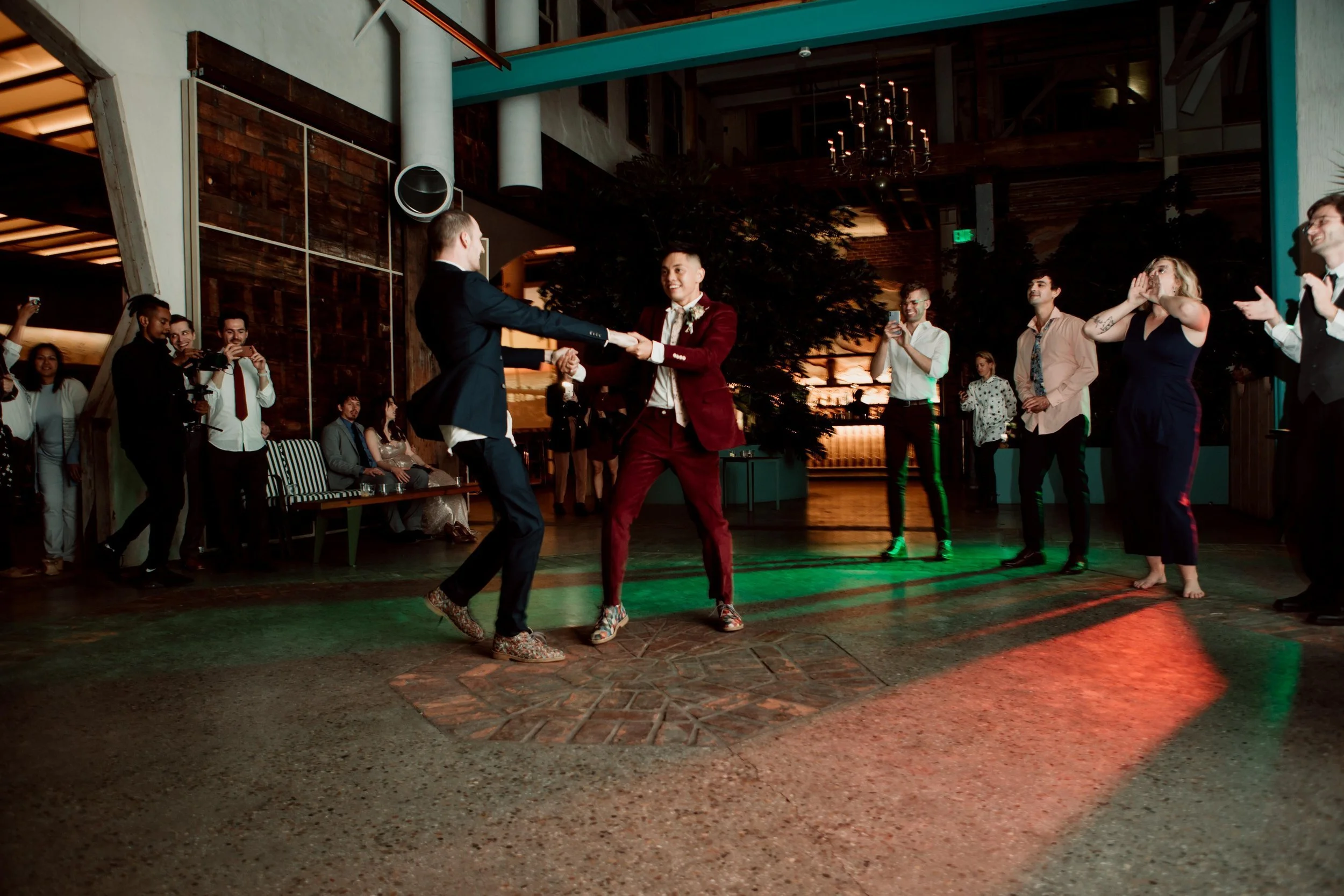The reception was a celebration of their relationship and friendships, with a stylish and chic atmosphere that matched the groom's personalities. The venue was beautifully decorated, with an impressive display of lights, mirrors, and greenery that created a stunning and unforgettable ambiance. The guests were treated to a delicious meal, with champagne flowing freely, and the music playing late into the night.